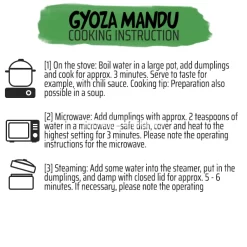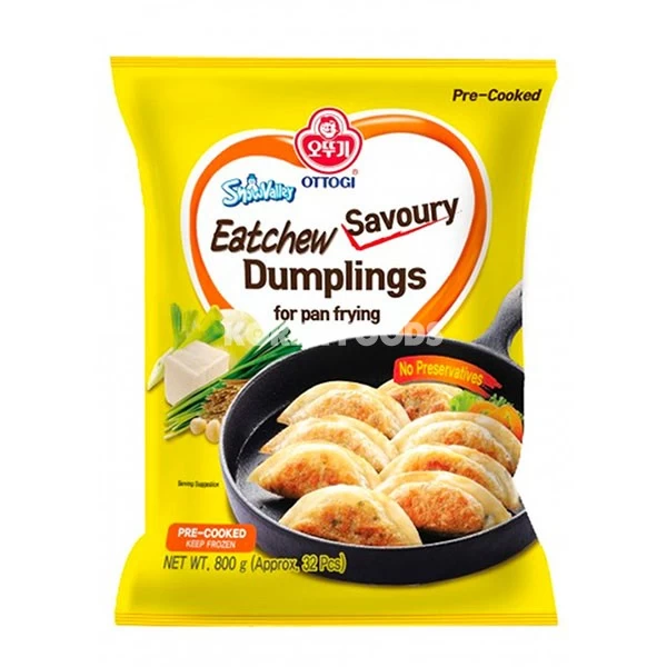 Water, Wheat Flour (21.9%, Green Onion (11.5%), Soybean Protein (8.4%), Leek (7.6%), Starch Vermicelli (7.3% Sweet Potato Starch, Processed Starch Product), Soybean Curd (2.6% (Soybean Powder, Firming Agent: E516, Stabiliser: (Water, Anti-foaming Agent: E900, Emulsifiers: E432, E436, E491, Thickener: E466), Corn Oil, Mandu Seasoning Powder Flavour Enhancer (E621), Salt, Soy Sauce Powder, Purified Glucose, Functional Crystal Glucose, Onion Powder, Dextrin, Shortening, Onion, Flavour Enhancer: E635, Thiamine Hydrochloride), Sugar, Sesame Oil, Garlic, Ginger, Salt, Flavour Enhancer (E621), Black Pepper Powder.