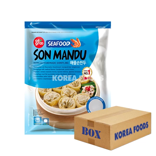 Wheat Flour, Squid, Surimi, Water, Chives, Canola Oil, Green Onion, Chinese Cabbage, Onion, Sea Mussel, Garlic, Textured Soy Protein, Shrimp, Salt, Soy Sauce (Soybean, Wheat, Salt, Water), Ginger, Seasoning, Sesame Oil, Sugar, Flavour Enhancer (E635, E640), Sea Lettuce, Soybean Oil, Humectant (E420), Emulsifier (E471, E322), Green Pepper, Black Pepper.